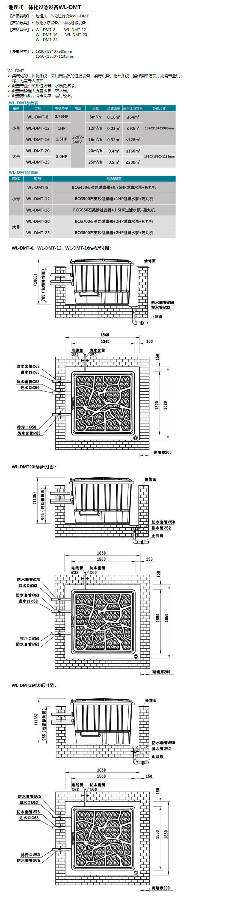泳池循環過濾設備 有兩種可供挑選:一種是以泳池過濾砂缸、循環水泵、石英砂為主的傳統泳池過濾設備;一種是以泳池一體機為主的無機房一體泳池過濾設備,設備類型有壁掛式、地埋式、平嵌式、臺階式的?! 鹘y砂缸 一體式 泳池消毒設備 有許多品種可供挑選:投藥計量泵、投藥器、泳池消毒藥劑、投藥桶、臭氧發生器、鹽氯機、銅銀離子發生器 水質監測設備 水質監控儀、驗水合 水下照明設備 泳池水