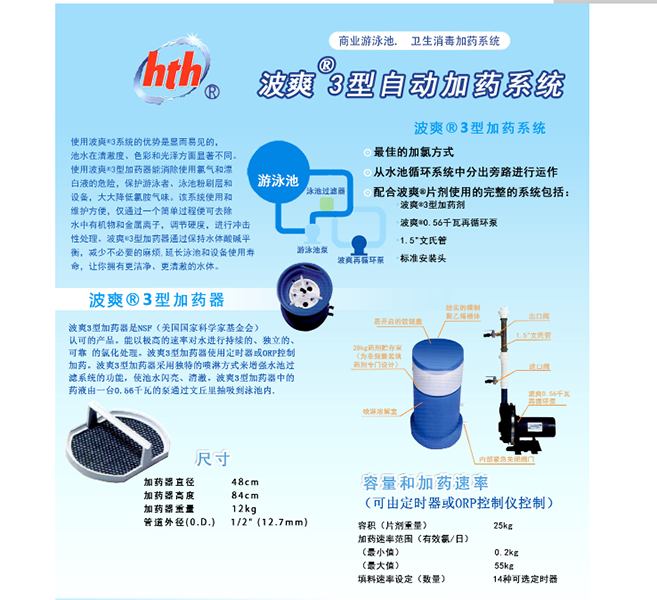 泳池循環過濾設備 有兩種可供挑選:一種是以泳池過濾砂缸、循環水泵、石英砂為主的傳統泳池過濾設備;一種是以泳池一體機為主的無機房一體泳池過濾設備,設備類型有壁掛式、地埋式、平嵌式、臺階式的?! 鹘y砂缸 一體式 泳池消毒設備 有許多品種可供挑選:投藥計量泵、投藥器、泳池消毒藥劑、投藥桶、臭氧發生器、鹽氯機、銅銀離子發生器 水質監測設備 水質監控儀、驗水合 水下照明設備 泳池水